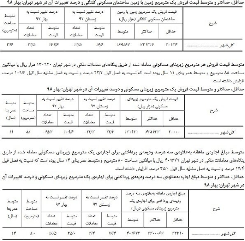 مرکز آمار گزارشی از تحولات قیمت زمین، آپارتمان و اجاره بها حدفاصل بهار ۹۷ تا بهار ۹۸ منتشر کرد که نشان میدهد قیمت زمین در مدت مذکور ۱۷۵ درصد و نرخ اجاره بها ۳۵ درصد رشد داشته است.